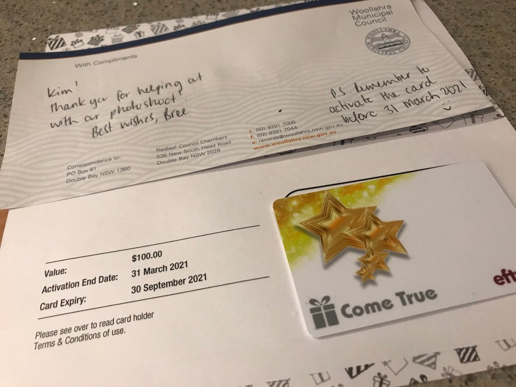 Gift I got for posing for pictures for Woollahra Council’s image bank. They will use the pics for brochures, advertising etc.