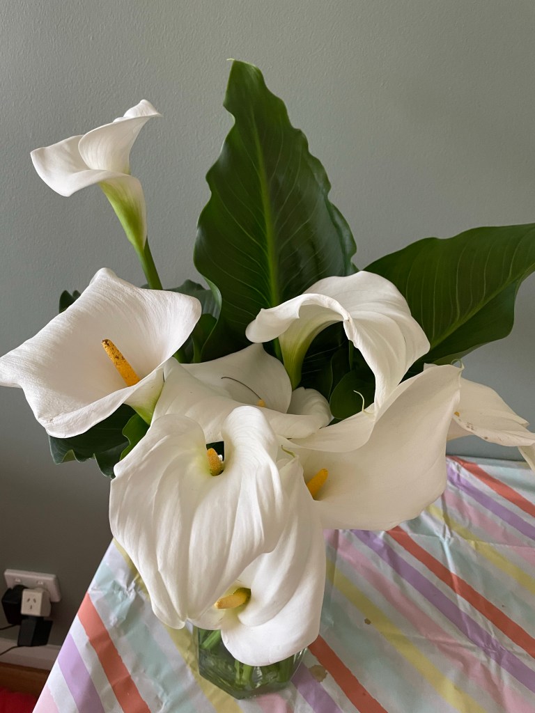 Gift flowers from last night Posted bykimbalinablogNovember 13, 2022Posted inUncategorized Roses from Mark & Carrie Calla Lilies from Damin and Sarah’s garden Share this:Share Click to share on Reddit (Opens in new window) Reddit