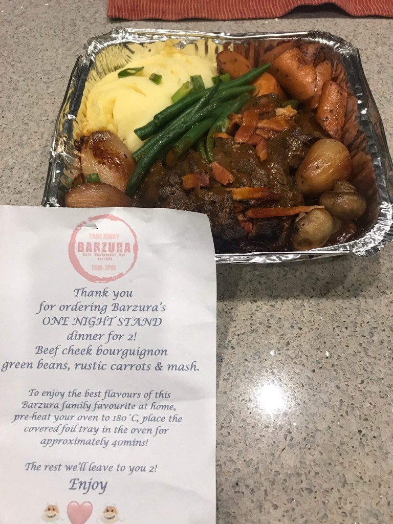 Went for a long walk, then a drive and out for dinner Went out to look at our old house on the walk Brought home a heat and serve meal from a local restaurant